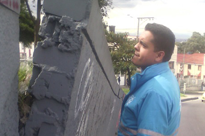 Durante el recorrido que la Contraloría de Bogotá adelantó en el barrio Villa de los Alpes, en la localidad de San Cristóbal, se evidenció un muro con inclinación y desprendimiento irregular, que puede colapsar y ocasionar daños a la comunidad del sector.