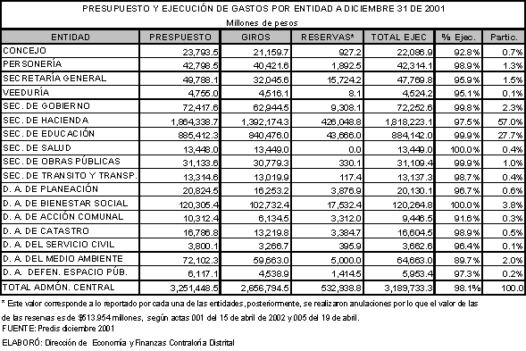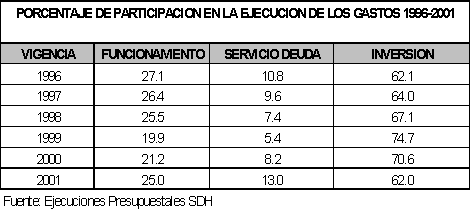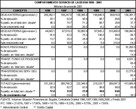 [8] Tomado del informe ejecutivo de la deuda pública del distrito capital a diciembre 31 de 2001, documento elaborado por la Subdirección de la auditoría del balance, del presupuesto, del tesoro, deuda público e inversiones financieras de la Contraloría Distrital.