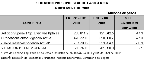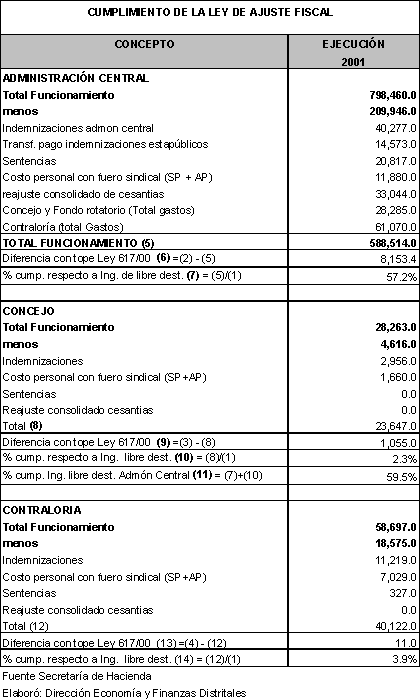 2001, refleja la inclusión en vigencia las leyes 617 de 2000 sobre saneamiento