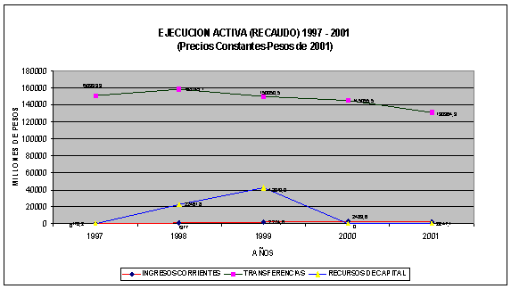 Comparando el nivel de ingresos por Transferencias, en pesos de 2001 o valores constantes, durante el período evaluado podemos observar que el mayor recaudo se presentó en la vigencia 1998 con $158.145,1 millones, seguido por la vigencia 1997 con $150.999,3 millones, luego por la vigencia 1999 con $150.050,5 millones; $145.055,5 millones en la vigencia 2000 y finalmente $130.964,3 millones en el año 2001, evidenciando una tendencia casi constante de decrecimiento en el nivel de recaudo de ingresos por transferencias durante los últimos tres años del período analizado.